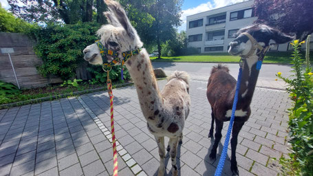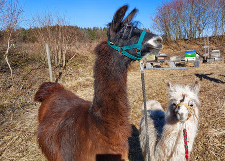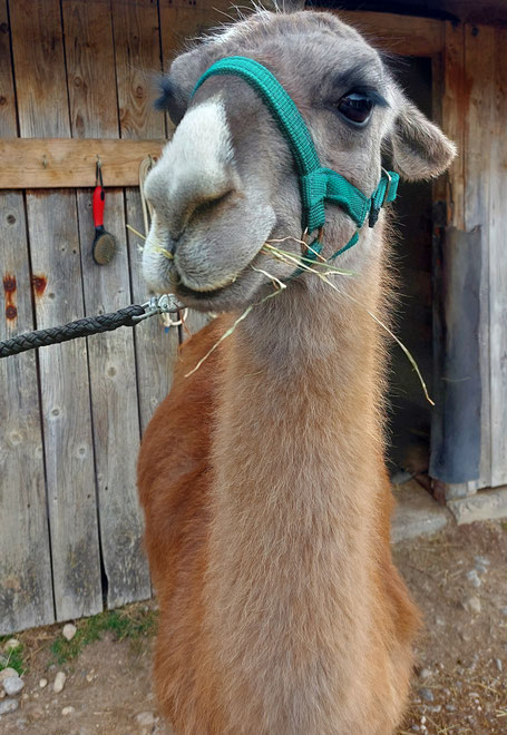 Unsere Lamas sind sehr ruhige und friedliche, wanderfreudige Begleiter an deiner Seite. Sie haben eine langjährige Erfahrung mit vielen Besuchern und lassen sich problemlos das eine oder andere Mal gerne am Hals streicheln. Das ist reine Routine, die Abläufe rund um das "Gassi gehen" sind den Tieren voll bekannt. Noch nie wurde ein Besucher von einem unserer Lamas angespuckt. Das viel bekannte Spucken findet nur persönlich unter den Tieren direkt statt, wenn es um die Rangordnung oder um den beliebten Platz an der Heuraufe oder dem Aussichtspunkt im Gehege geht.